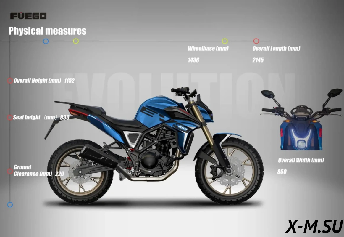 Мотоцикл Fuego THE EVO 450 сочетает в себе отличную управляемость и проходимость благодаря продуманной конструкции и высокому клиренсу. Современный дизайн и яркие световые элементы делают его заметным на дороге, а комфортная посадка — идеальным для длительных поездок.
